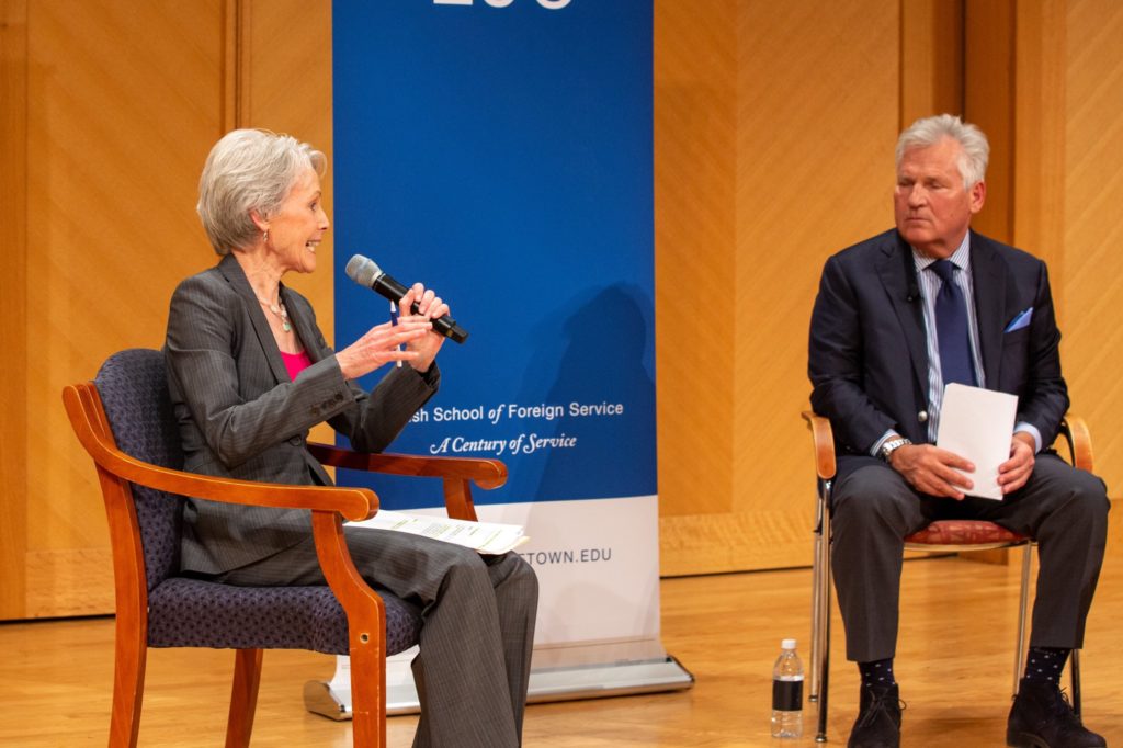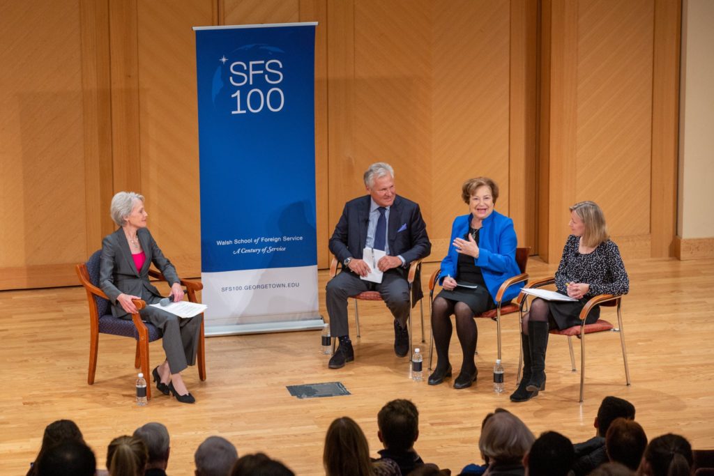 On Saturday, November 16, 2019, as a part of the Walsh School of Foreign Service’s Centennial Anniversary celebration weekend of special commemorative events, SFS Centennial Fellow and former CNN contributor Jill Dougherty (S’13) joined Julia Gurganus (RASP’94), Visiting Scholar for Carnegie Russia, Dr. Angela Stent, Professor and Director of CERES, and Aleksander Kwasniewski, former President of Poland, for a discussion on “Resurgent Russia.”